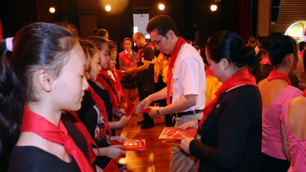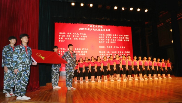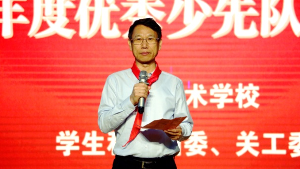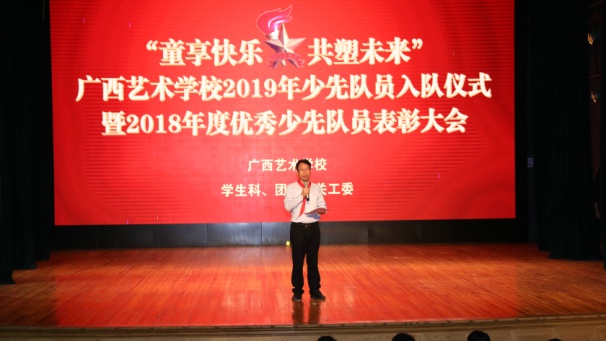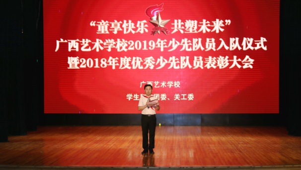 广西艺术学校党委书记罗征在会上致词。罗书记对新少先队员和优秀少先队员表示热烈祝贺!他说:少先队员是充满希望的新一代,要继承革命先辈的光荣传统,要爱祖国、爱人民,要努力学习,要从小事做起,从现在做起,树立远大理想,用实际行动书写绚丽的明天!