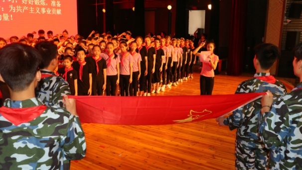 2017级舞蹈一班的黄雨珊代表老少先队员上台发言并带领新队员进行入队宣誓,黄雨珊表示:作为一名光荣的中国少年先锋队队员,我们要为飘扬的队旗添上光辉的一笔;今天,我们磨练羽翼,明天,我们将搏击长空!我们在知识的海洋中,踏浪而歌,奋勇前进,沿着夸父的脚步追逐太阳,循着精卫的身影修补蓝天……